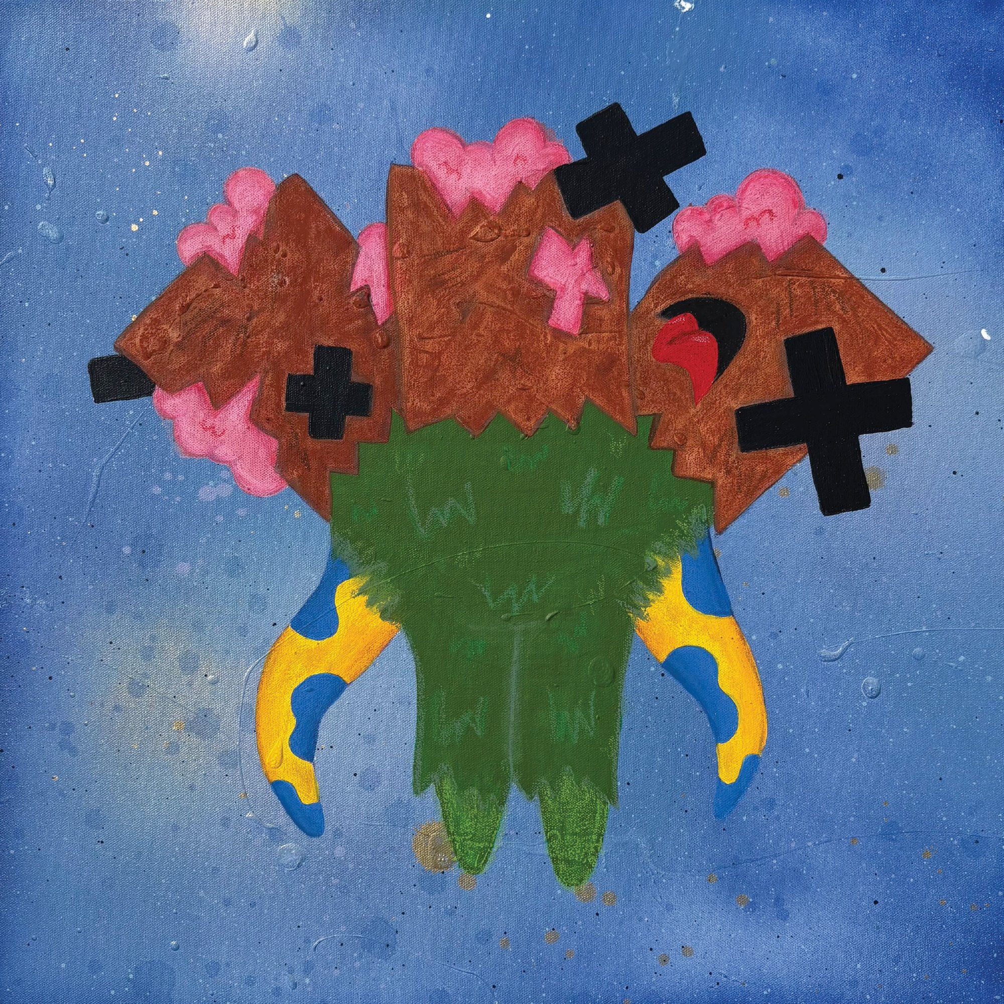 acrylic, spray paint, oil stick, colored pencil, marker, and nature on canvas